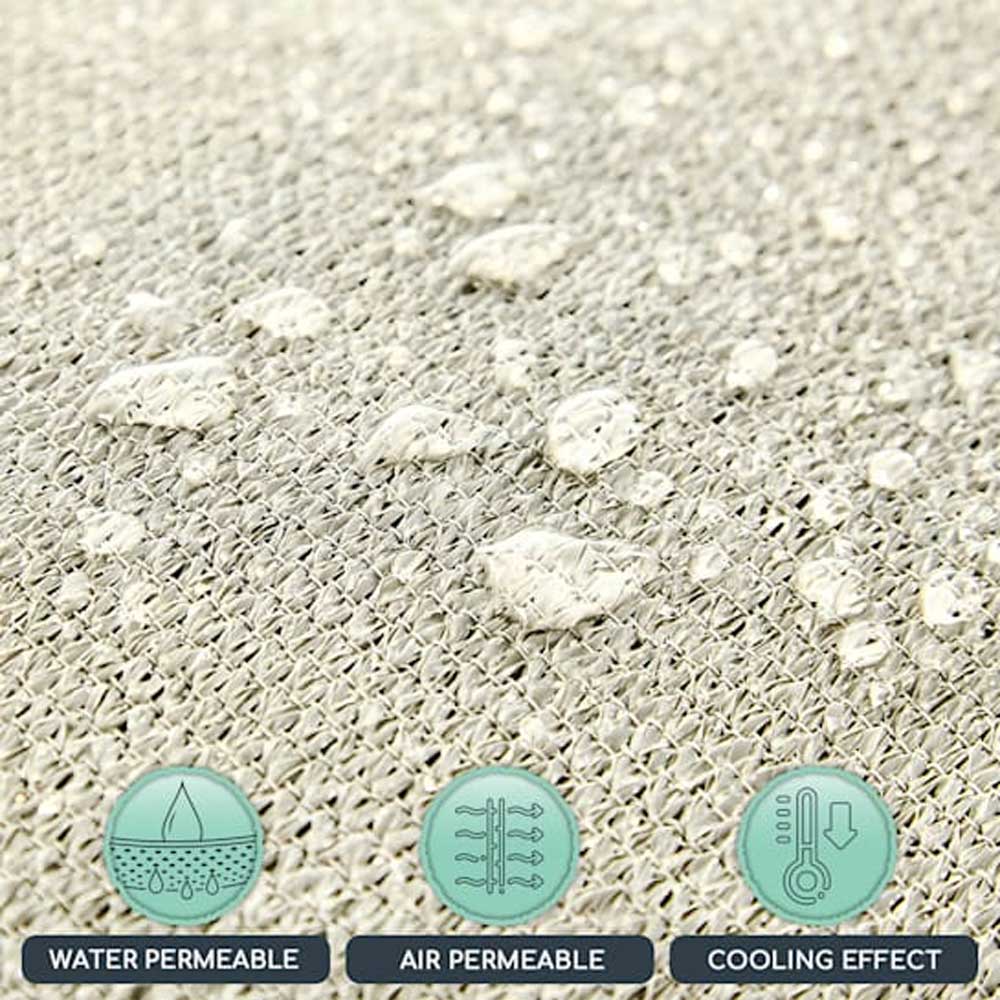 Z nerjavečimi obročki je pritrjevanje zelo enostavno. Enostavno prevlečete vrvice skozi pritrdilne obročke, ki jih lahko poljubno pritrdite v okolici. Za dolgotrajno namestitev priporočamo namesto vrvice uporabo napenjalnih kavljev ali vponk. Zaradi odpornega poliestra lahko sončno ponjavo namestite zelo trdno in enostavno. Razen tega je material zelo zračen, kar zagotovi, da se pod streho ne bo kopičila toplota. Ponjava dobro prenese dež in ima dobro nosilnost zaradi trdnega materiala, visoke kakovosti obdelave in dvojnega šiva.