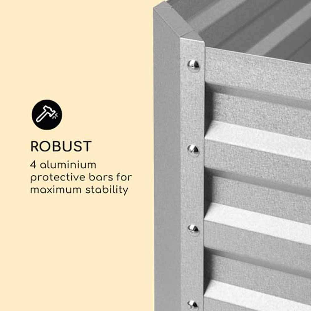 Sočen paradižnik, sladke jagode, hrustljave buče in aromatska zelišča lahko zdaj preprosto vzgojite sami zaradi optimalnih pogojev za rast. Enoletnice in veselje skozi celotno leto ob vrtnarjenju na vrtu: trden okvir visoke grede je izdelan iz jeklene valovite pločevine, ki je zaščitena proti vremenskim vplivom s posebno cinko-aluminijevo površino. Zaradi tega je High Grow Streight kos vetru in vremenu skozi celotno leto. 4 aluminijeve zaščitne letvice zagotavljajo maksimalno stabilnost celotne konstrukcije.