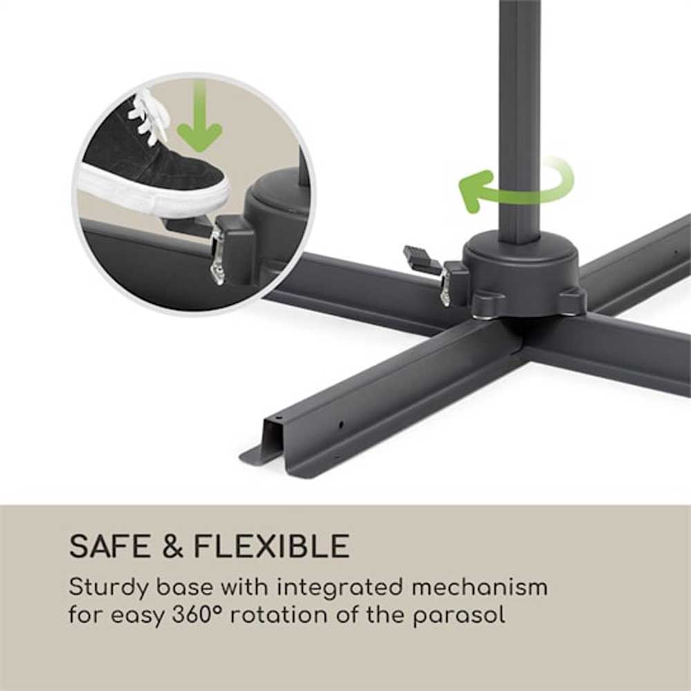 Zaradi varnega temelja se lahko senčnik Belo Horizonte fleksibilno vrti okrog svoje osi za 360° in omogoča tudi brez kompaktnega premeščanja hladno senco v primeru spreminjajočih se sončnih žarkov. Streha s premerom 292 cm iz poliestra z PA prevleko, ki je odporen proti vodi in faktorjem zaščite pred UV žarki 30+ je odporna na lahek dež in zaneslivo zaščiti pred UV žarki. Robustna in lahka aluminijasta cev z zaščito proti rji je zanimiva s svojo visoko stabilnostjo, ampak omogoča tudi enostaven transport celotne konstrukcije. Zaradi inteligentne konstrukcije s plastično kljuko in aluminijastim ročajem kljuke se lahko senčnik v trenutku odpre in zapre in se prilagodi sončnim žarkom v zahtevanem kotu v 4 nivojih. Ko se zapre se lahko prostorsko varčno shrani do naslednje uporabe. Podstavek zagotavlja varno namestitev za vsakih okoliščin.