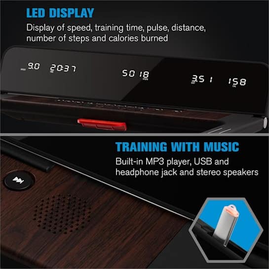 - LED zaslon: prikazovanje hitrosti, časa treninga, pulza, razdalje, števila korakov in porabljenih kalorij