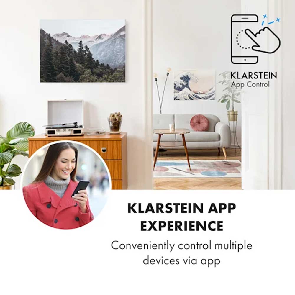 Zdaj še pametnejši: nove infrardeče grelnike Klarstein Wonderwall Air Art Smart je mogoče povezati z lokalnim omrežjem WiFi in jih nato upravljati od koder koli z aplikacijo Klarstein App Experience. Ni vam treba vzeti pametnega telefona ali tabličnega računalnika, saj lahko z vgrajenim glasovnim upravljanjem prek Alexe ali Googla povsem preprosto dajete glasovna navodila eni ali več napravam hkrati. Seveda lahko grelno ploščo upravljate tudi popolnoma ročno na napravi.