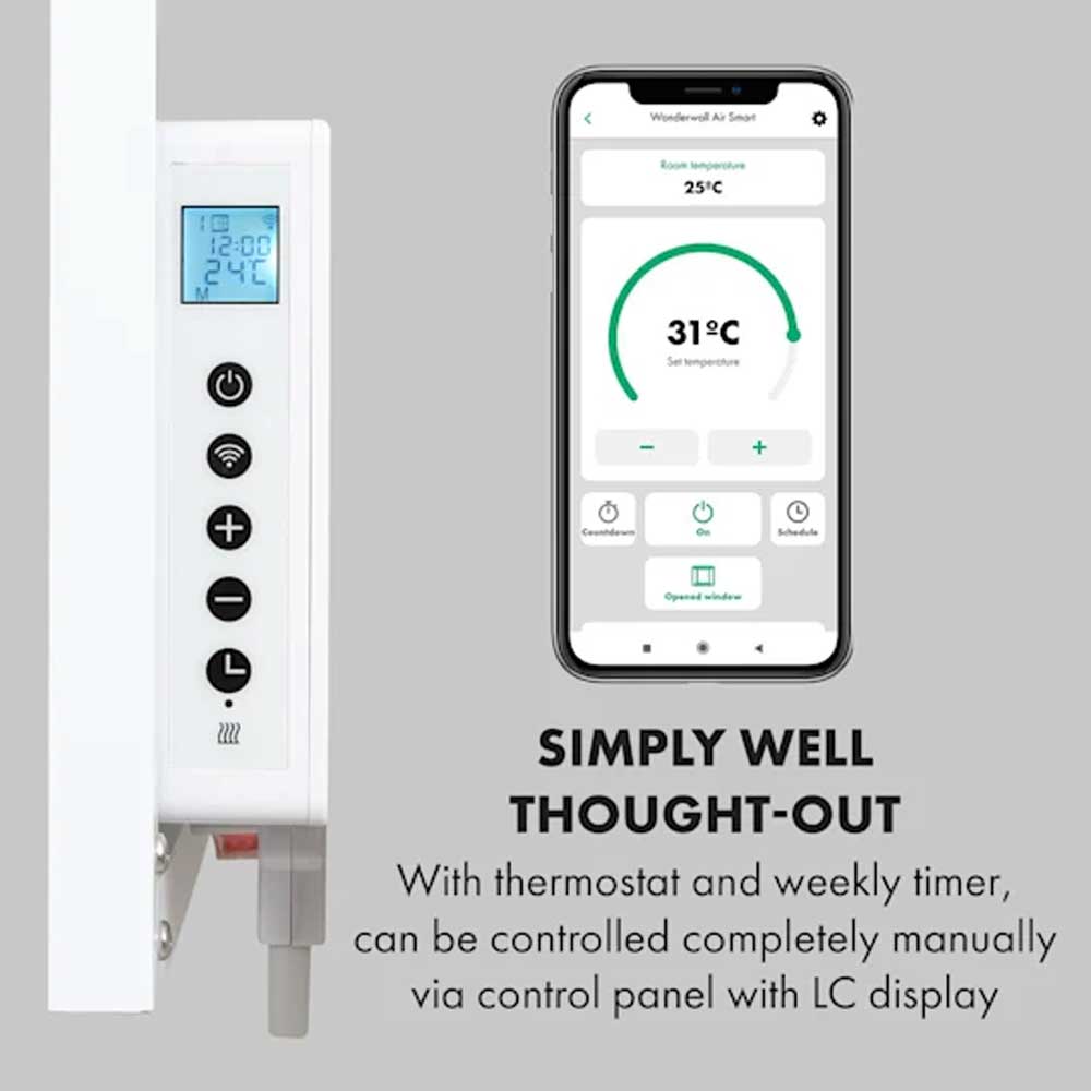 S termostatom in naprednimi funkcijami, kot sta samodejni izklop in zaznavanje odprtega okna, boinfrardeči grelnik zadovoljil tudi najzahtevnejše stranke. Nastavljiv tedenski časovnik omogoča programiranje časa ogrevanja za vsak dan v tednu. Zaradi ravne oblike, hitrega segrevanja in prostorsko varčne stenske namestitve je grelnik še posebej primeren za uporabo v kopalnici. Zato je naprava Wonderwall Air Art Smart z razredom zaščite IP44 popolnoma zaščitena pred škropljenjem z vodo.