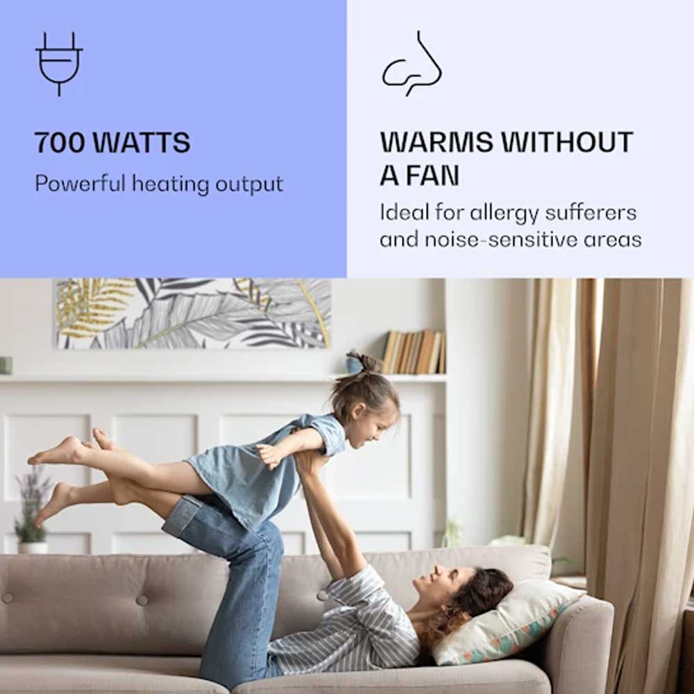 - Brez prahu in hrupa: infrardeča plošča greje brez ventilatorja – idealna za alergike in prostore s potrebo manjše hrupnosti