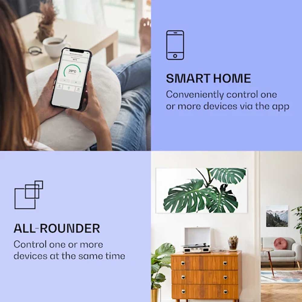 Zdaj so grelci še pametnejši: nove infrardeče grelce Klarstein Wonderwall Air Art Smart lahko povežete v lokalno mrežo WiFi in jih upravljate na daljavo od koderkoli z aplikacijo Klarstein App Experience. Pametnega telefona ali tablice sploh ni potrebno prijeti v roke, kajti z integriranim glasovnim upravljanjem lahko pošiljate ukaze enemu ali tudi več napravam istočasno preko Alexy ali Google. Grelno ploščo lahko seveda upravljate tudi ročno in neposredno na napravi.