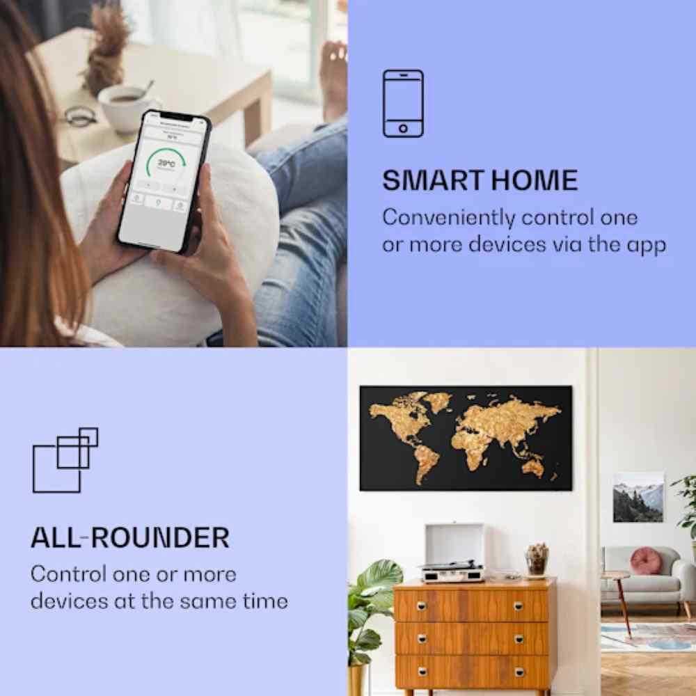 Zdaj so grelci še pametnejši: nove infrardeče grelce Klarstein Wonderwall Air Art Smart lahko povežete v lokalno mrežo WiFi in jih upravljate na daljavo od koderkoli z aplikacijo Klarstein App Experience. Pametnega telefona ali tablice sploh ni potrebno prijeti v roke, kajti z integriranim glasovnim upravljanjem lahko pošiljate ukaze enemu ali tudi več napravam istočasno preko Alexy ali Google. Grelno ploščo lahko seveda upravljate tudi ročno in neposredno na napravi.
