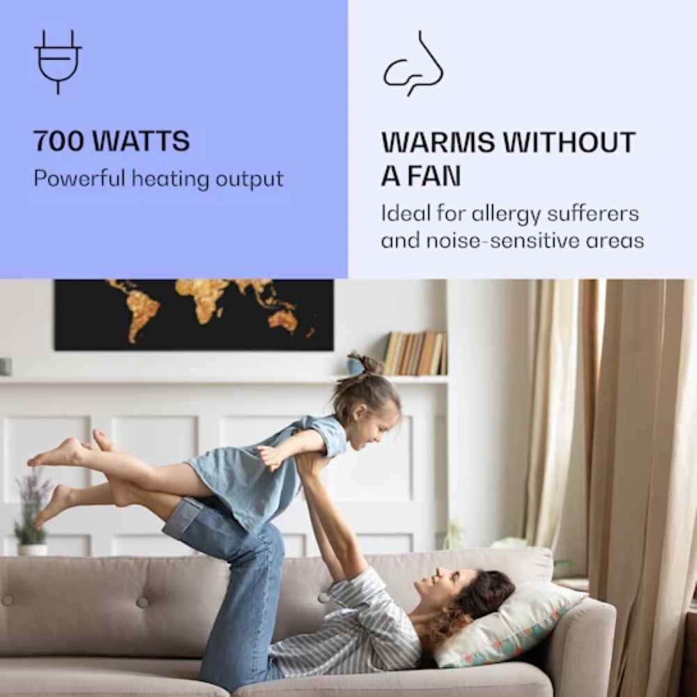 - Brez prahu in hrupa: infrardeča plošča greje brez ventilatorja – idealna za alergike in prostore s potrebo manjše hrupnosti