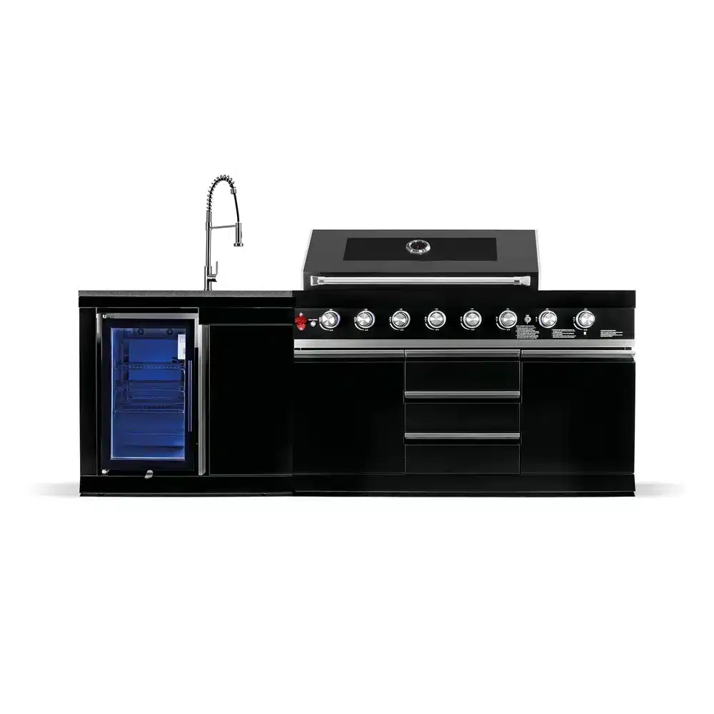 Zunanja kuhinja BB-S1 združuje moč profesionalnega 8-gorilnega žara, praktičen hladilnik in umivalnik z izvlečno prho v elegantni, prostorsko učinkoviti zasnovi.
