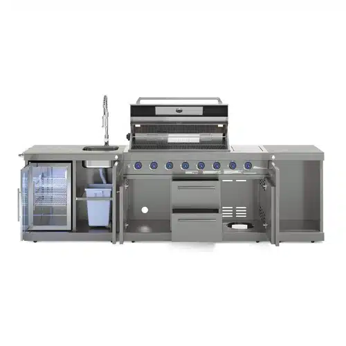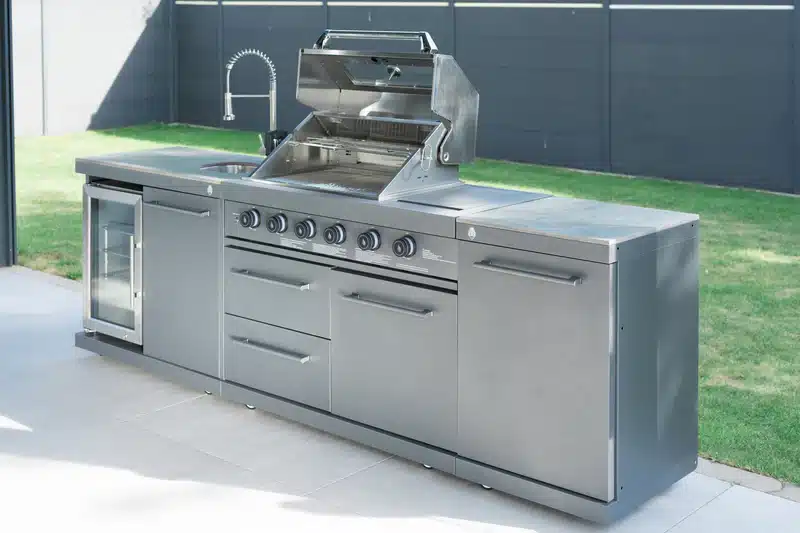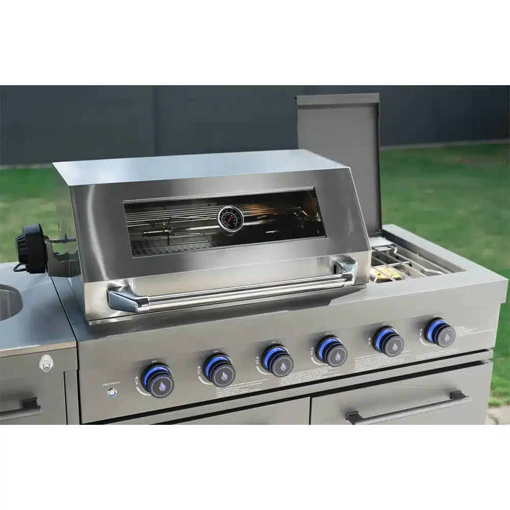 Zunanja kuhinja EMPIRE M2 združuje 6-gorenjski plinski žar, hladilnik z umivalnikom in pripravljalni modul v elegantno modularno postavitev.