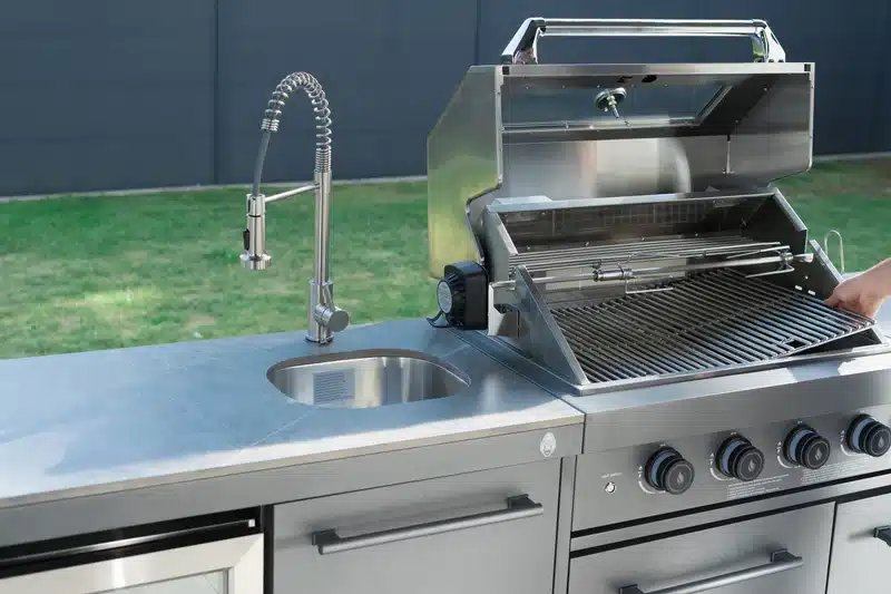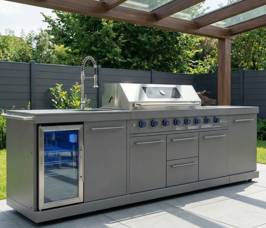 Modularna zunanja kuhinja z 6 gorilniki, hladilnikom in umivalnikom.