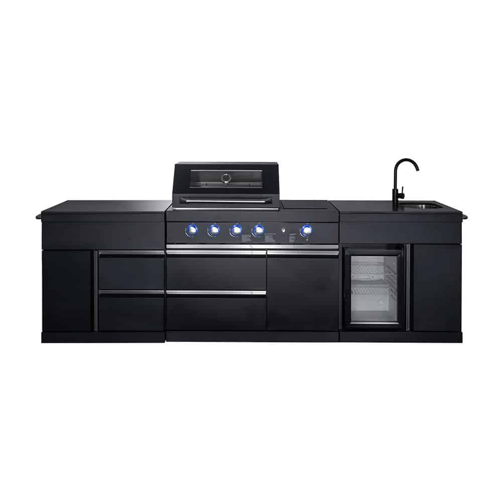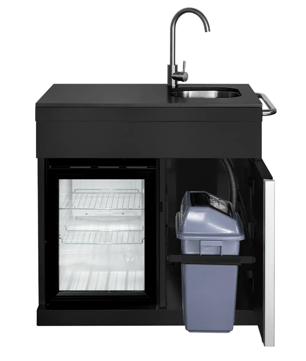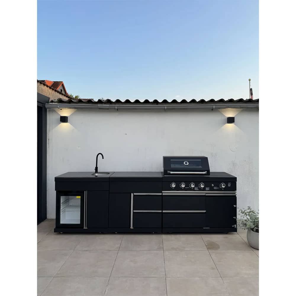 Gre za popoln, samostoječ kuhinjski komplet, ki vključuje vse, kar potrebujete za pripravo hrane na prostem – od zmogljivega plinskega žara do hladilnika, pomivalnega korita in prostornih omaric.