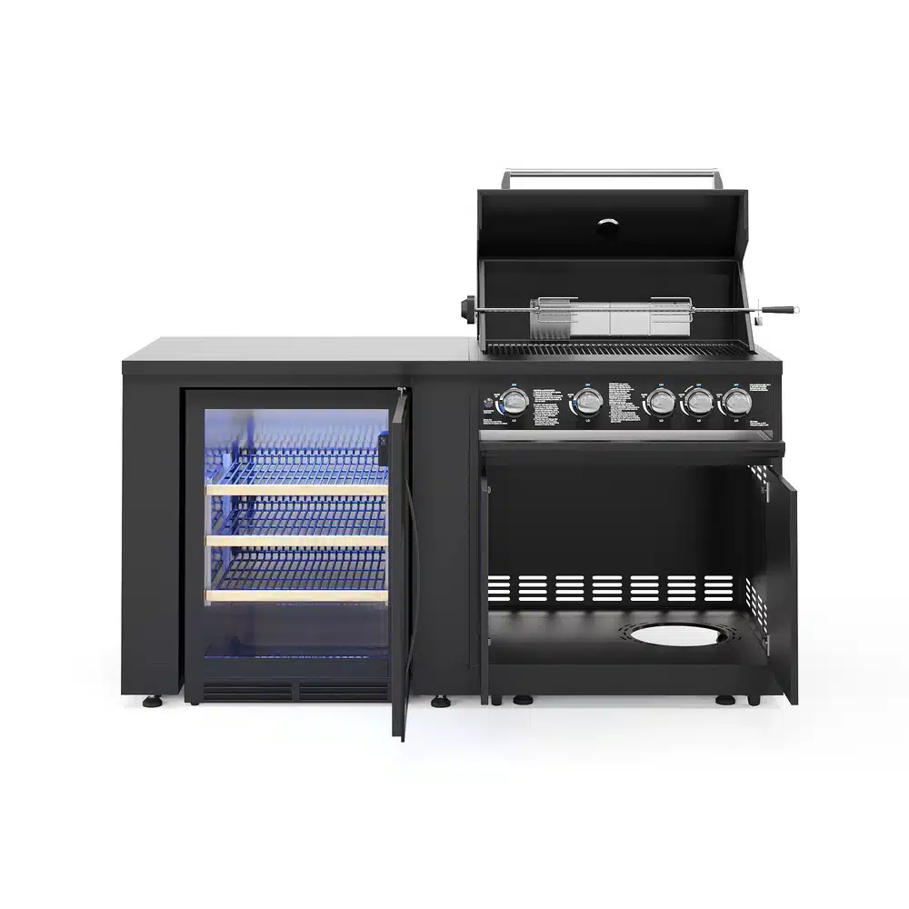 - Zunanja kuhinja JUNGLE S1 združuje zmogljiv 5-gorilni plinski žar in velik hladilnik v robustni črni jekleni konstrukciji.