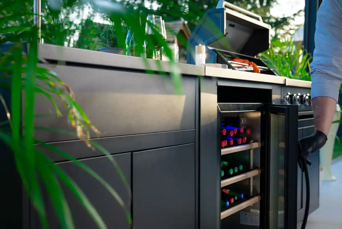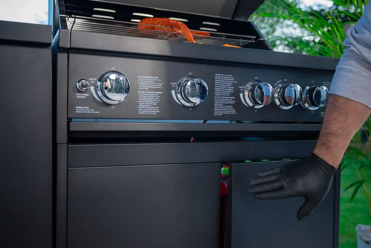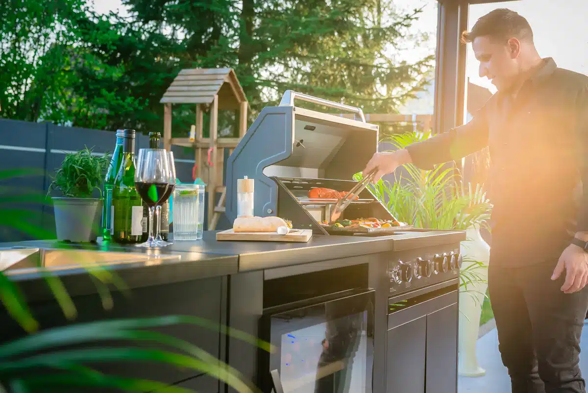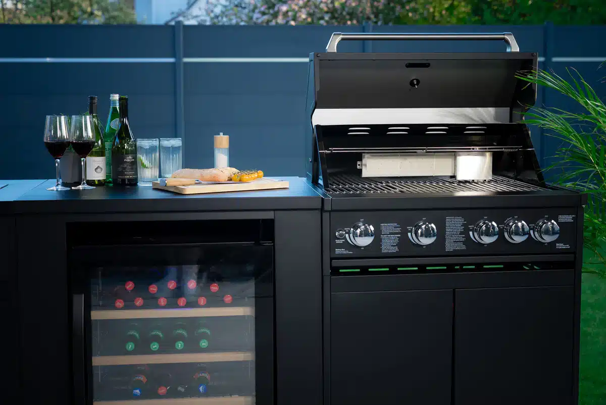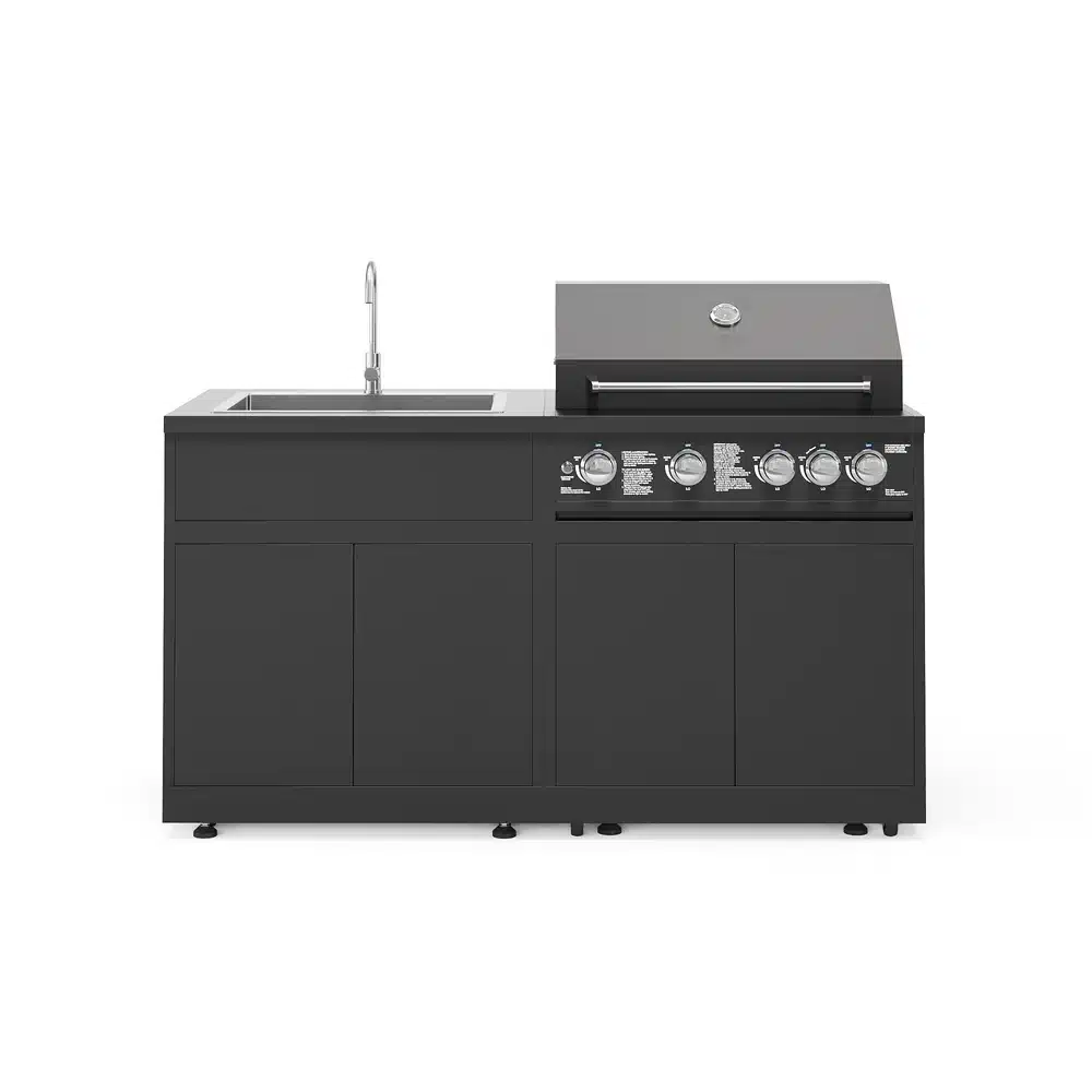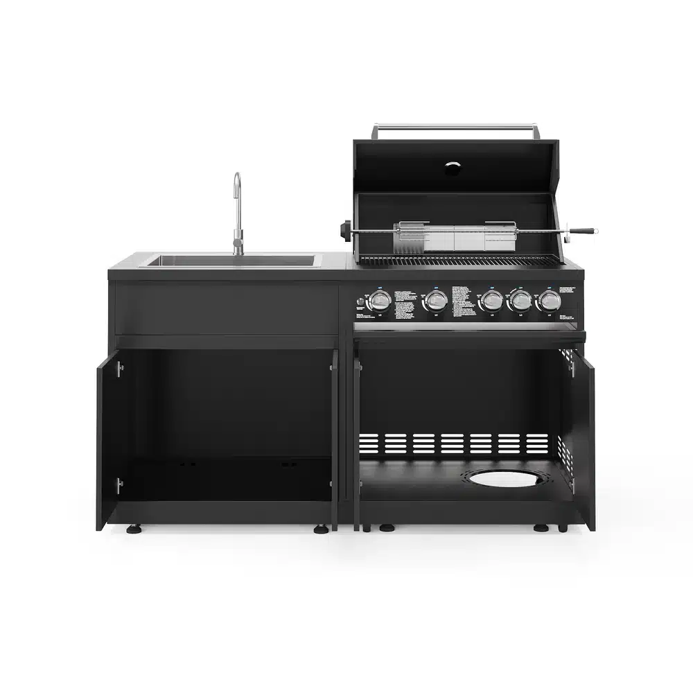 - Zunanja kuhinja JUNGLE S2 združuje močan 5-gorilni plinski žar in elegantni umivalnik v robustni črni jekleni zasnovi.