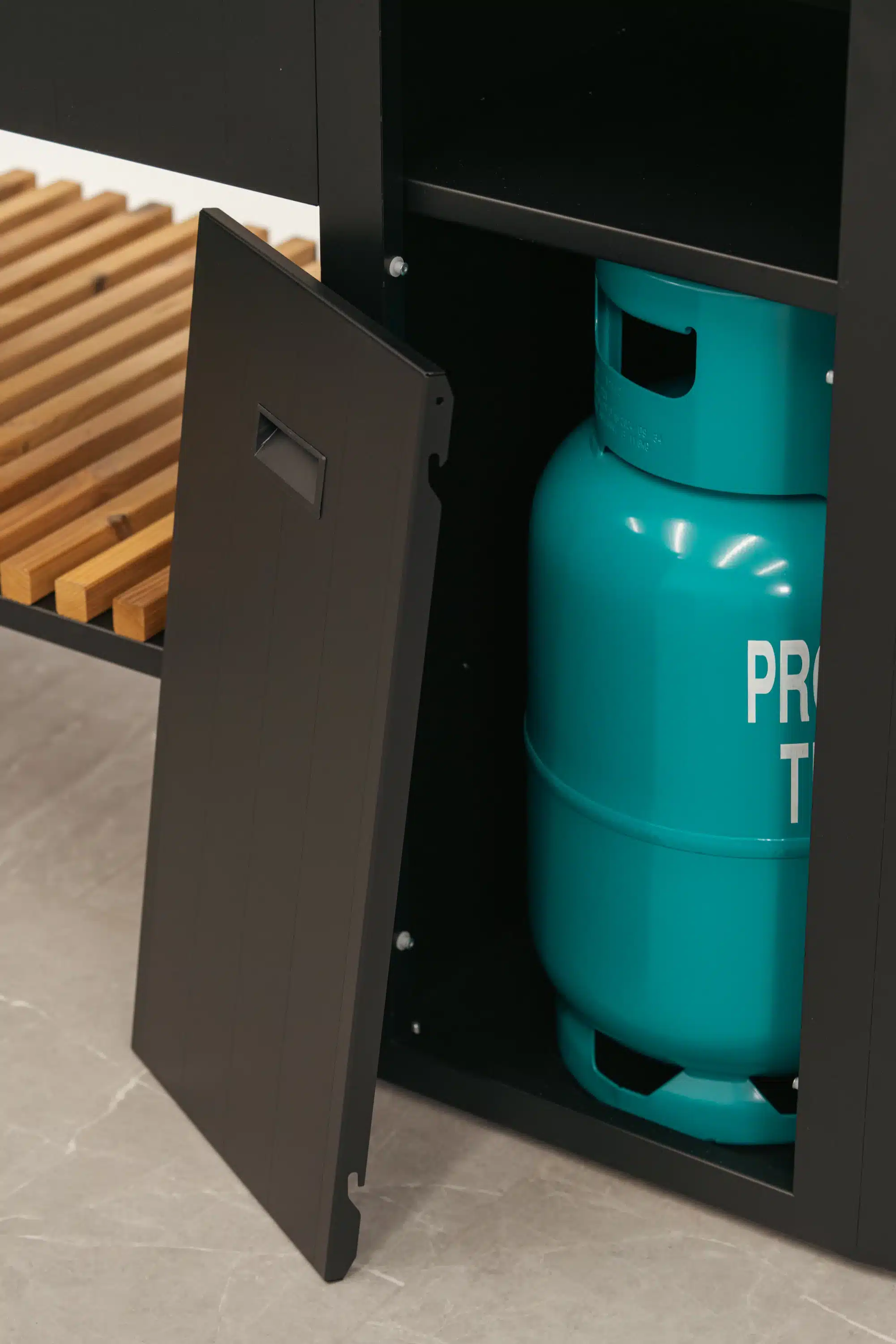 Integriran plinski žar s tremi gorilniki iz nerjavečega jekla (304) omogoča enakomerno segrevanje in odlično pripravo hrane. Kuhinja vključuje tudi lijak za enostavno pomivanje, prostor za plinsko jeklenko in odpadke ter odprto polico za shranjevanje dodatkov.