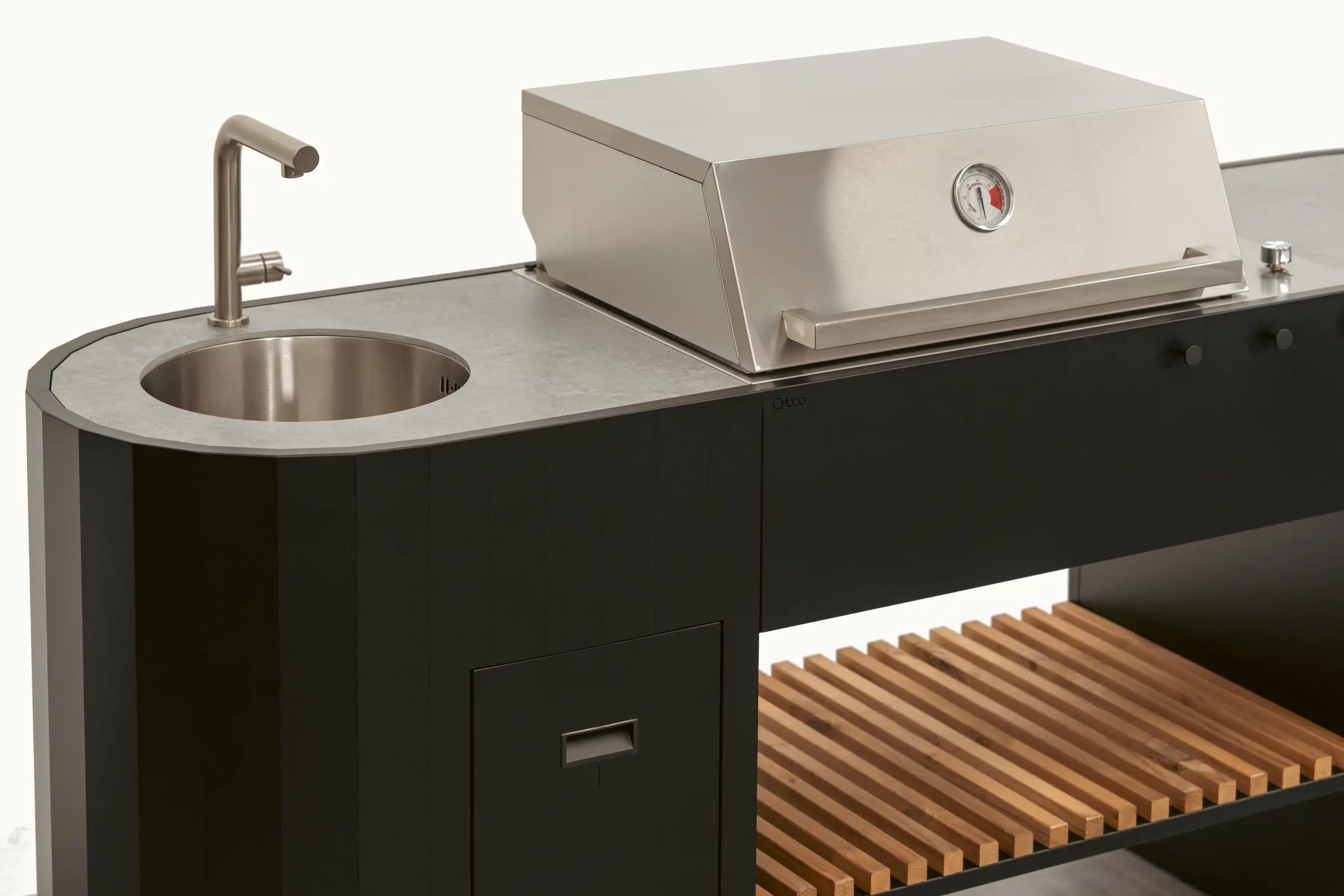 Kompaktna zunanja kuhinja OVO GL združuje plinski žar, lijak, pult iz Dekton® materiala ter praktičen prostor za shranjevanje. Idealna rešitev za sodobno outdoor kuhanje na terasi ali vrtu.