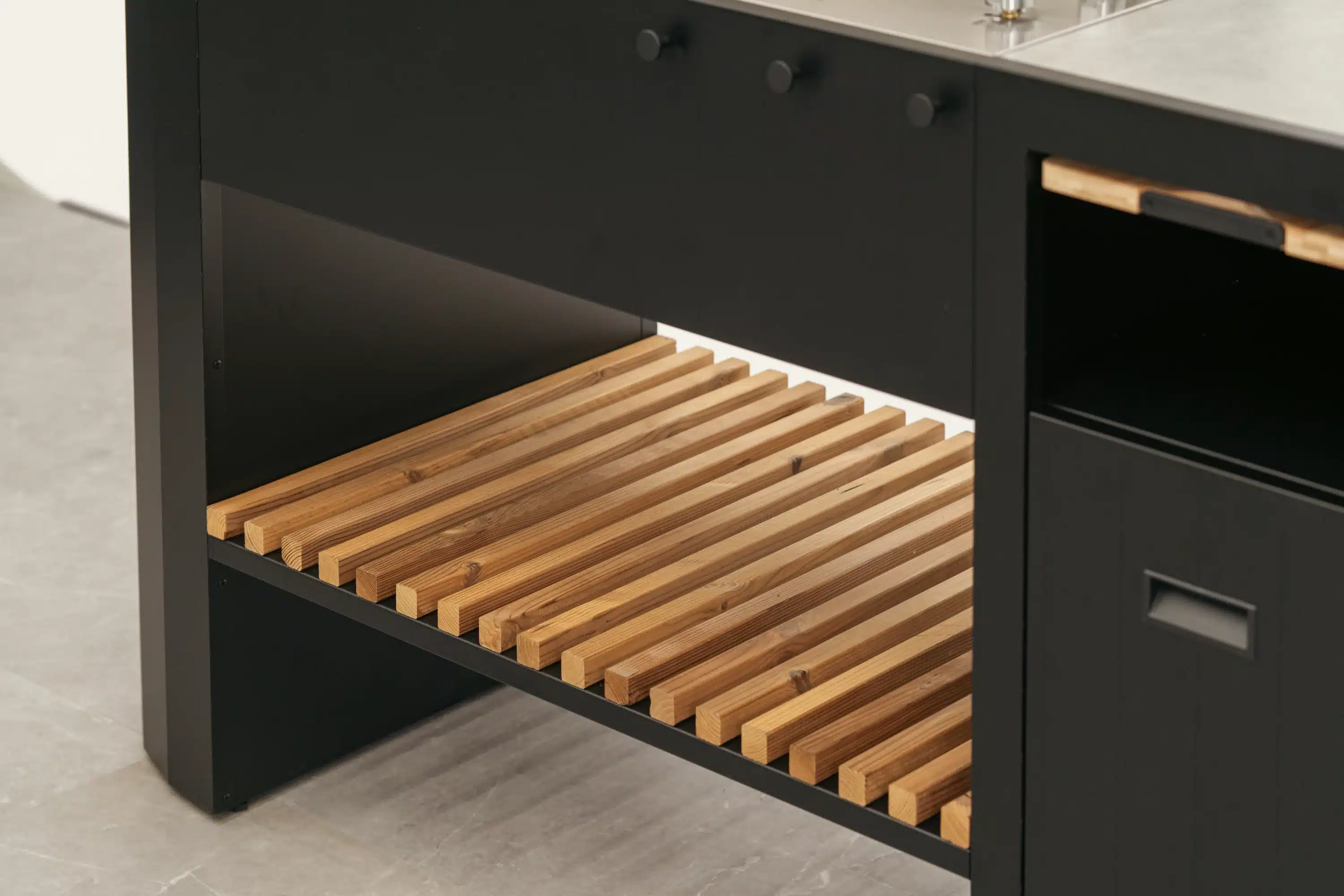 Vgrajen plinski žar s tremi gorilniki iz nerjavečega jekla 304 omogoča enakomerno porazdelitev toplote in natančen nadzor temperature. Poleg tega kuhinja vključuje prostor za plinsko jeklenko, odprto polico za shranjevanje, leseno desko za rezanje ter praktičen vgrajen nosilec za pijačo.