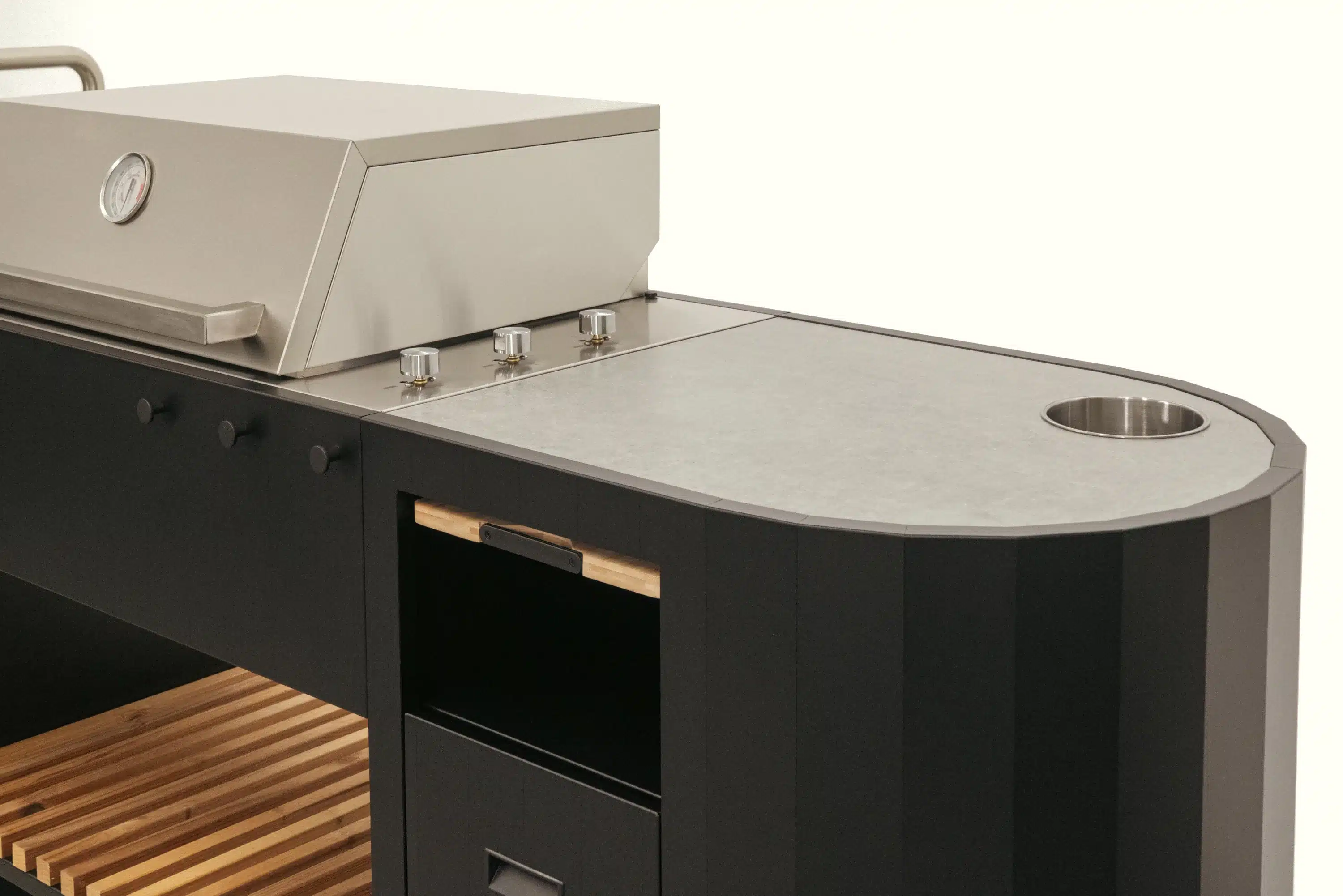 OVO GM zunanja kuhinja z vgrajenim plinskim žarom (3 gorilniki), Dekton® delovno ploščo in robustnim pocinkanim jeklenim ohišjem. Idealna rešitev za moderno kuhanje na prostem z elegantnim dizajnom in praktično funkcionalnostjo.
