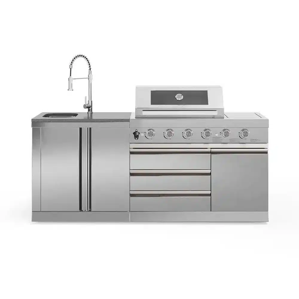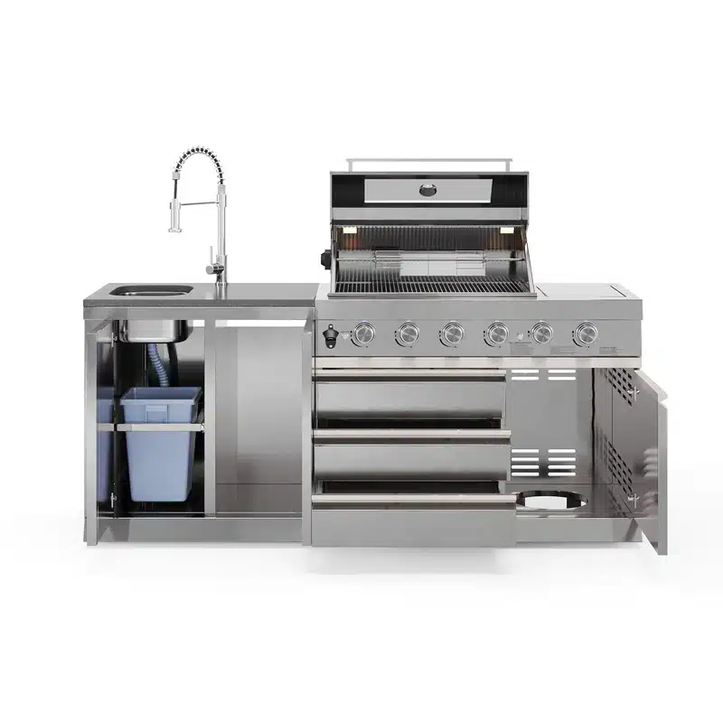 Izdelana iz 100 % nerjavnega jekla in pravega naravnega kamna, ta kuhinja združuje premium videz s praktičnostjo in odpornostjo na vse vremenske pogoje.