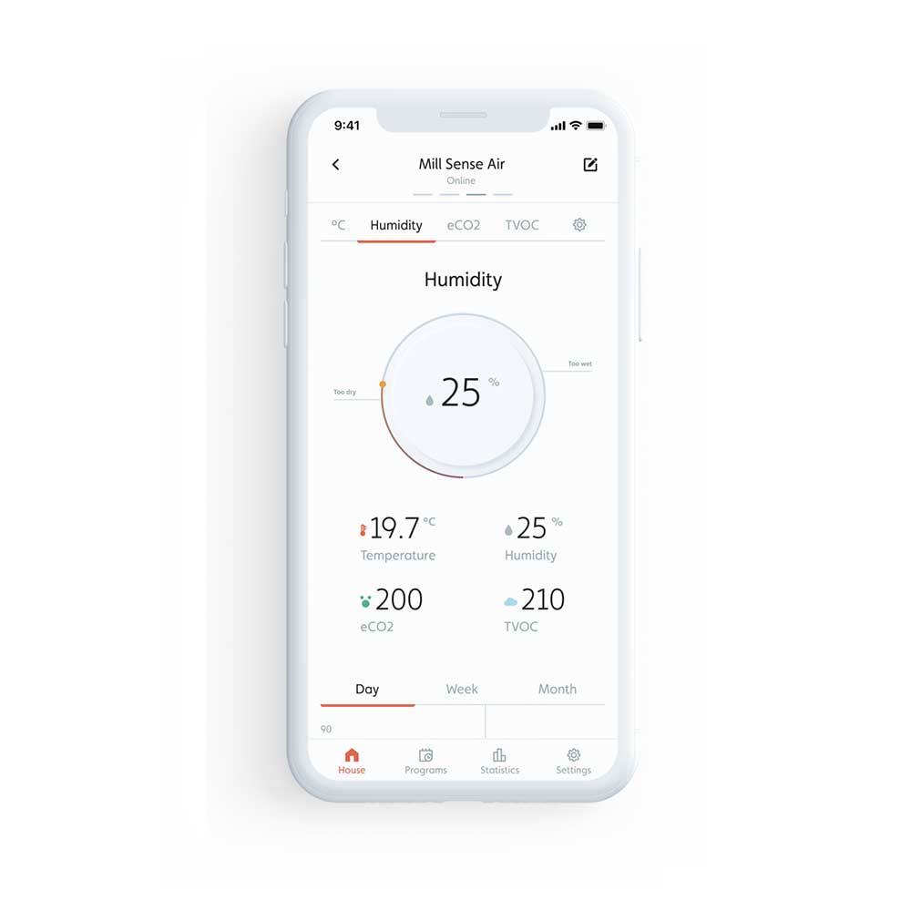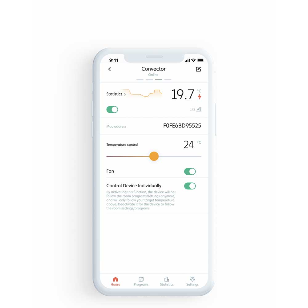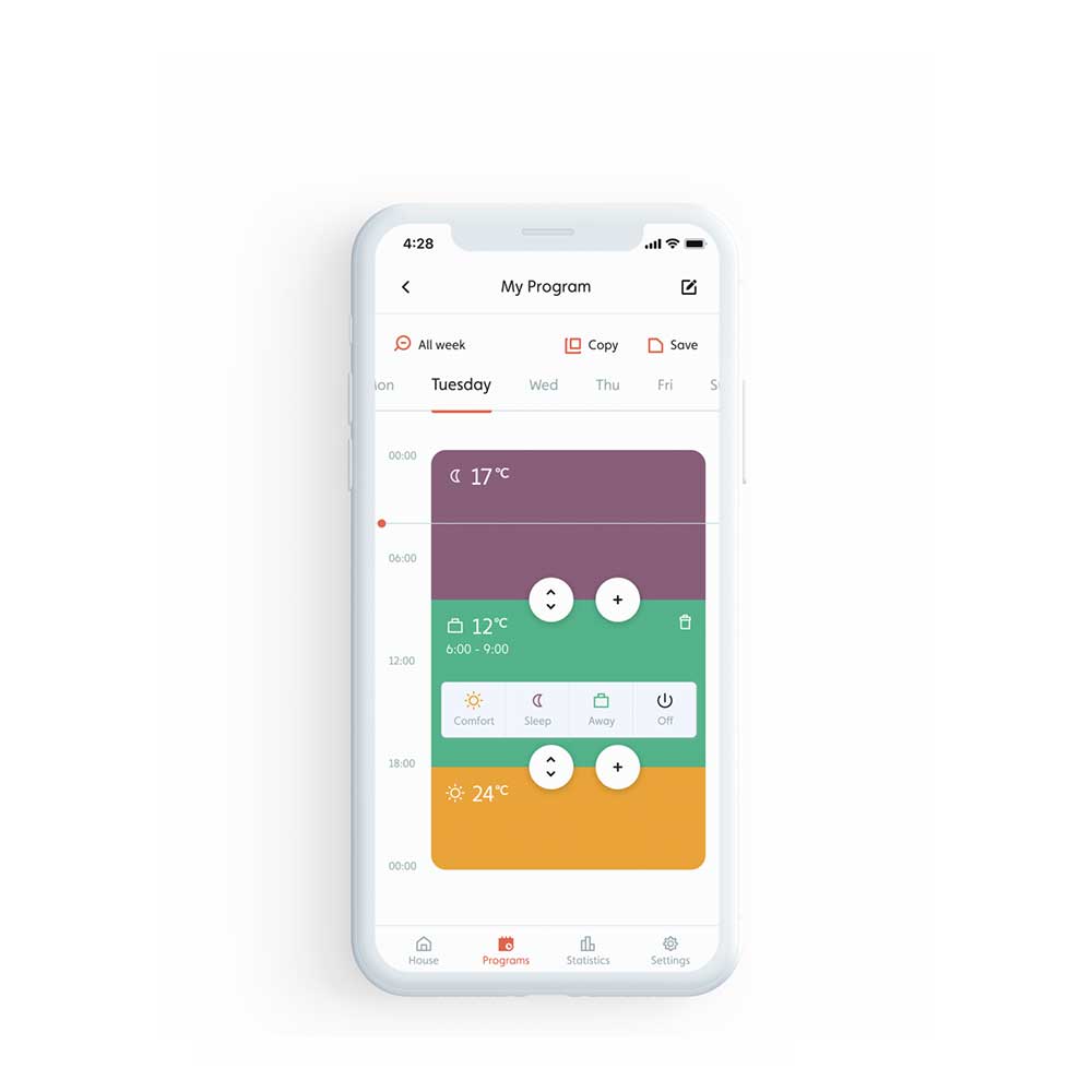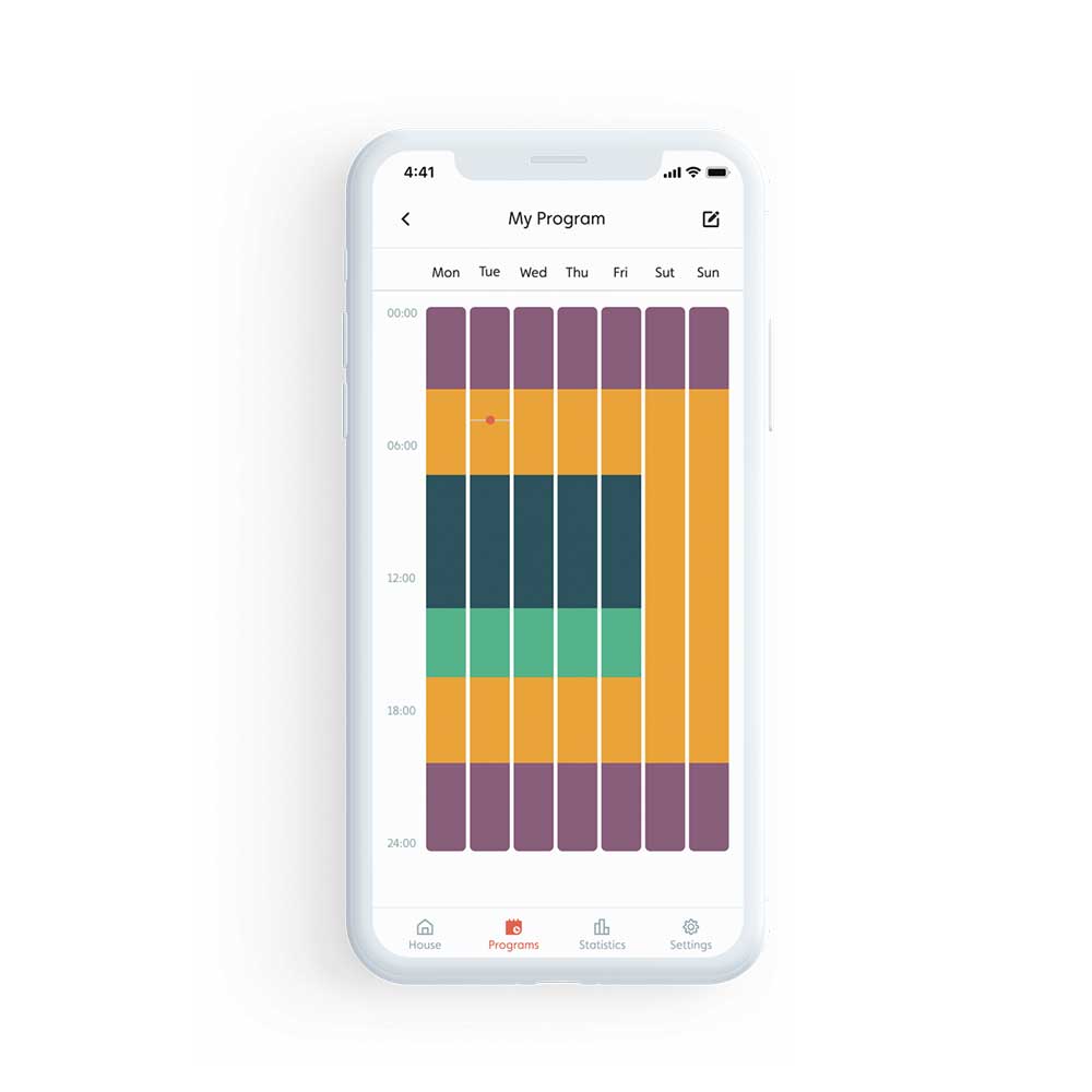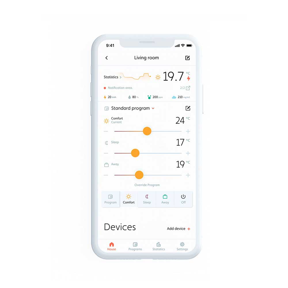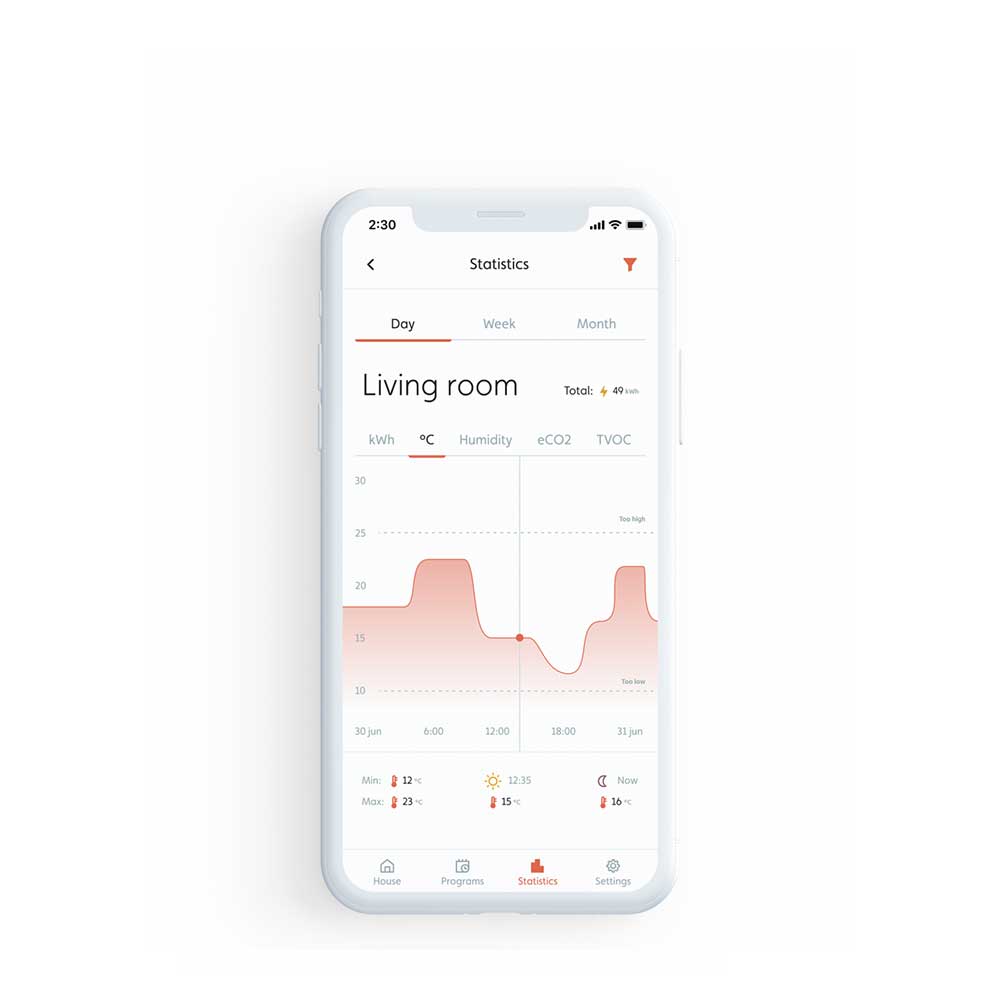 - Pregled podatkov: pregleden zaslon LED za intuitivno nastavitev termostata, možnost pregleda tudi preko aplikacije