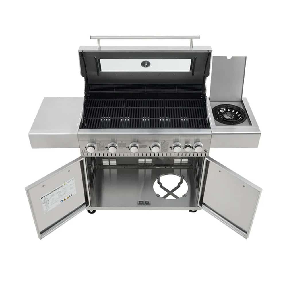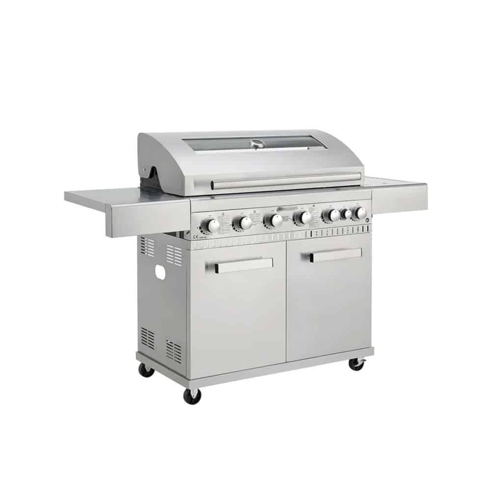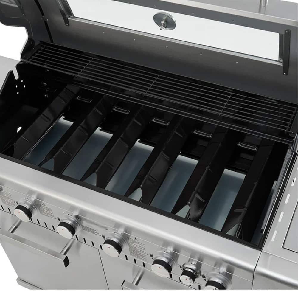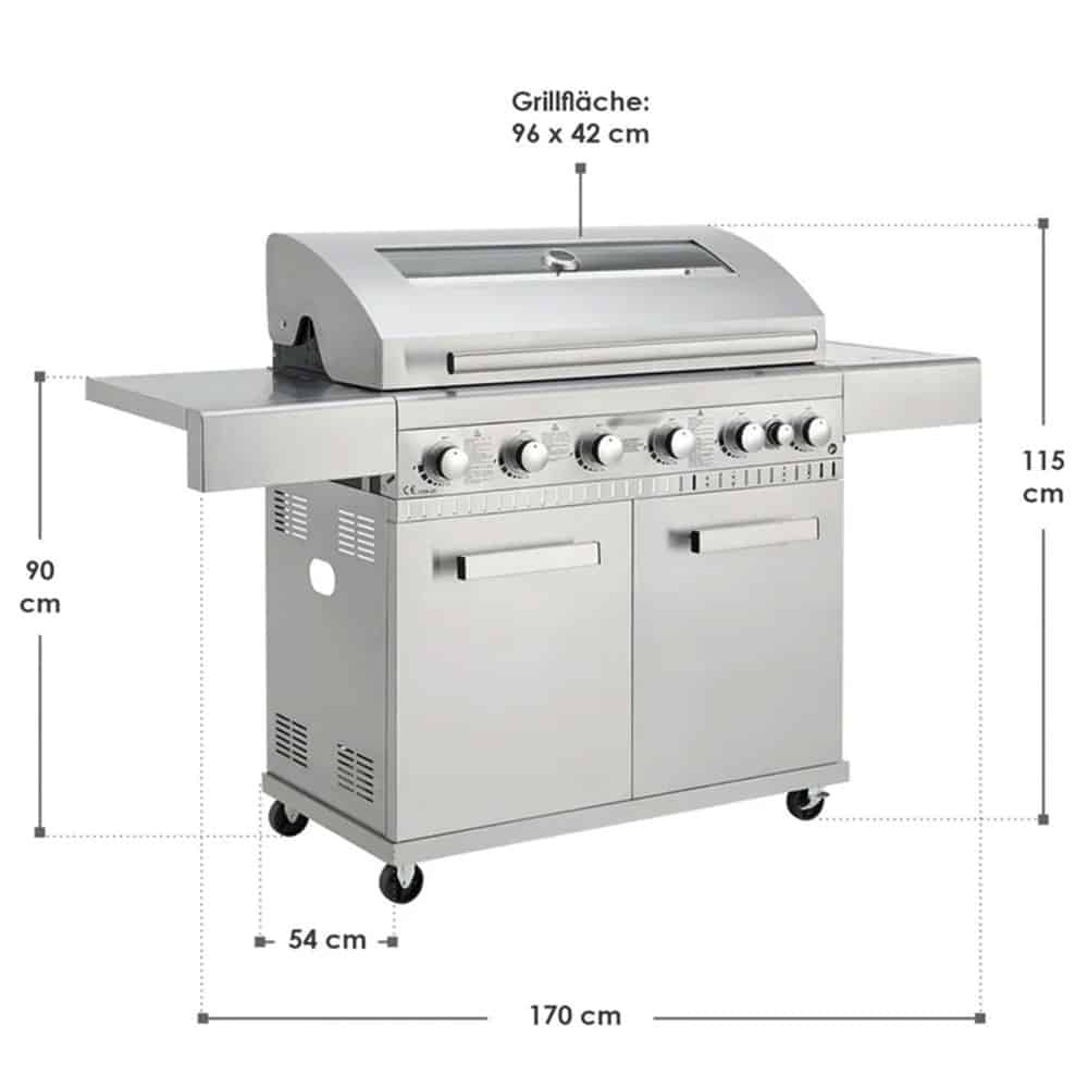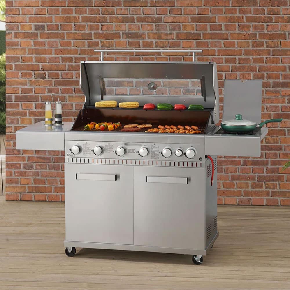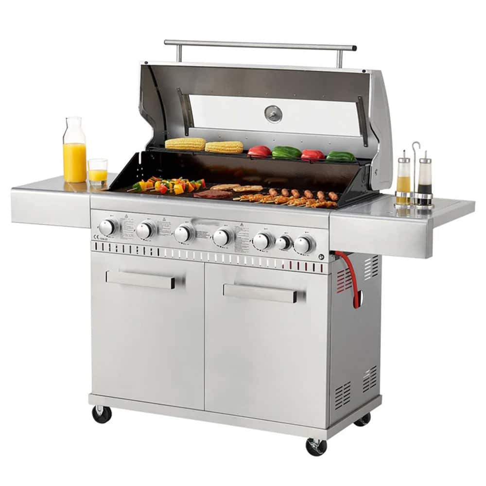 • Dodatki: Piezo vžig, rešetka za ohranjanje toplote, 2 stranski odlagalni površini, 6 gorilnikov, 1 stranski gorilnik, LED vrtljivi gumbi (baterije niso vključene)