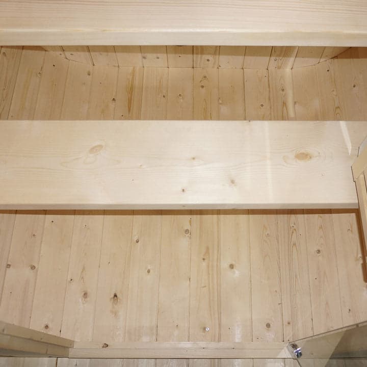 Notranjost je izdelana iz masivnega smrekovega lesa, ki zagotavlja prijetno klimo in stabilnost. Dve različni širini klopi omogočata sedenje ali sproščeno poležavanje, medtem ko LED osvetlitev in priložen komplet dodatkov – vedro, zajemalka, peskovnik, termometer – omogočajo udobno in profesionalno savnanje.