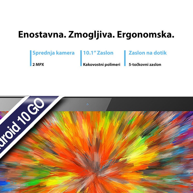 Temelj zasnove je zmogljiv štiri jedrni procesor. Za dovolj prostora za vaše aplikacije, fotografije ter glasbo poskrbi 16 GB notranjega pomnilnika, ki ga lahko še dodatno razširite s spominsko kartico do velikosti 128GB (ni priložena). Operacijski sistem Android 10 GO je pametna rešitev, ki zagotavlja hitro ter tekoče delovanje in obenem ponuja veliko možnosti za razširitev funkcionalnosti vašega novega tabličnega računalnika, vgrajena baterija s kapaciteto 6500 mAh pa bo poskrbela, da bo tablica vedno na voljo, ko jo boste potrebovali.