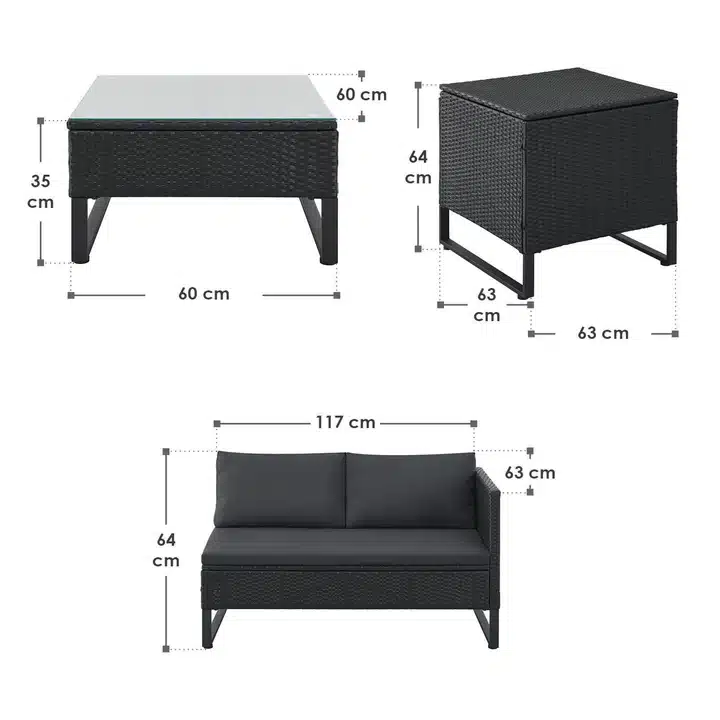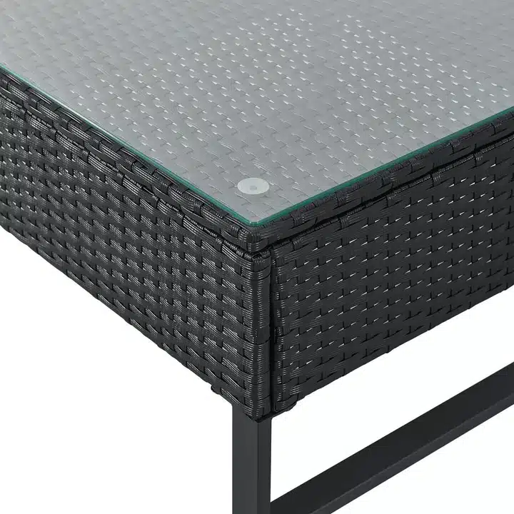 Material pohištva: jeklo (prašno lakirano), polyrattan, kaljeno steklo