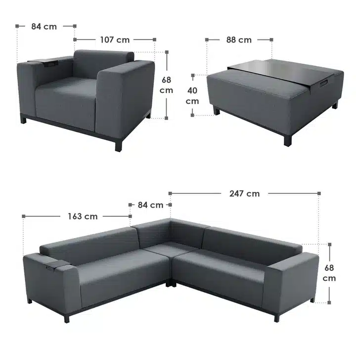Set vključuje elegantno kotno zofo, fotelj, tabure in dve odlagalni pladnji, kar omogoča raznoliko postavitev in prilagoditev tvojemu prostoru. Sodoben dizajn z ravnimi linijami in temno sivo barvo se popolno poda v vsak luksuzen zunanji ambient.